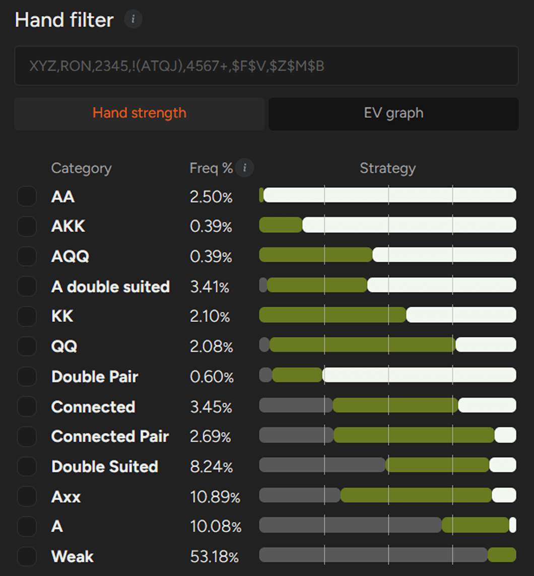 In PLO Genius, every hand belongs to one of 13 categories. Such a breakdown helps you see patterns. You can quickly check how a specific category performs and compare the expected value (EV) of different actions for individual combos.